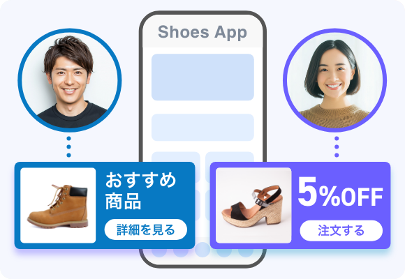ユーザーの属性情報や、アプリID連携を行うことで、アプリユーザー別に最適なクーポンを配信する機能です。カスタマイズを行うことでお客様の会員情報を基に情報配信することも可能です。