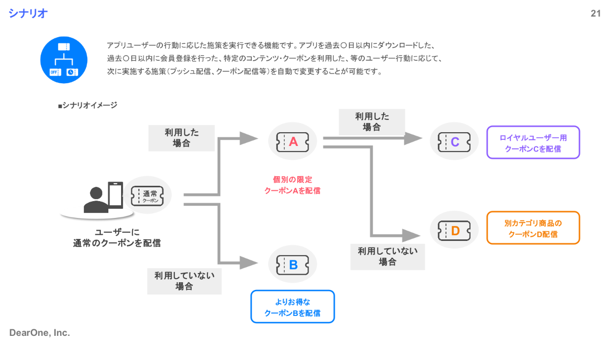カスタマイズの参考として、株式会社DearOneが提供するアプリ開発サービス「ModuleApps2.0」に標準搭載されている「シナリオ」機能の例をお見せします。