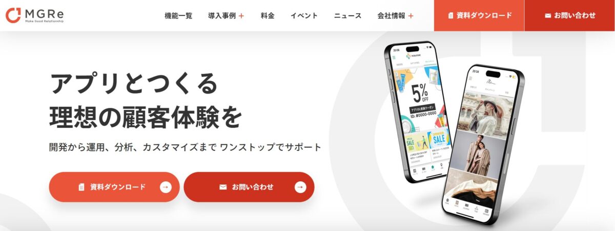 メグリ株式会社が運営する「MGRe(メグリ)」は、開発から運用、分析、カスタマイズまでワンストップでサポートするアプリ開発サービスです。標準機能+追加カスタマイズが可能なほか、ダッシュボードでアプリの利用状況を確認できるなど、分析機能も搭載されています。