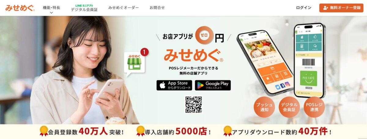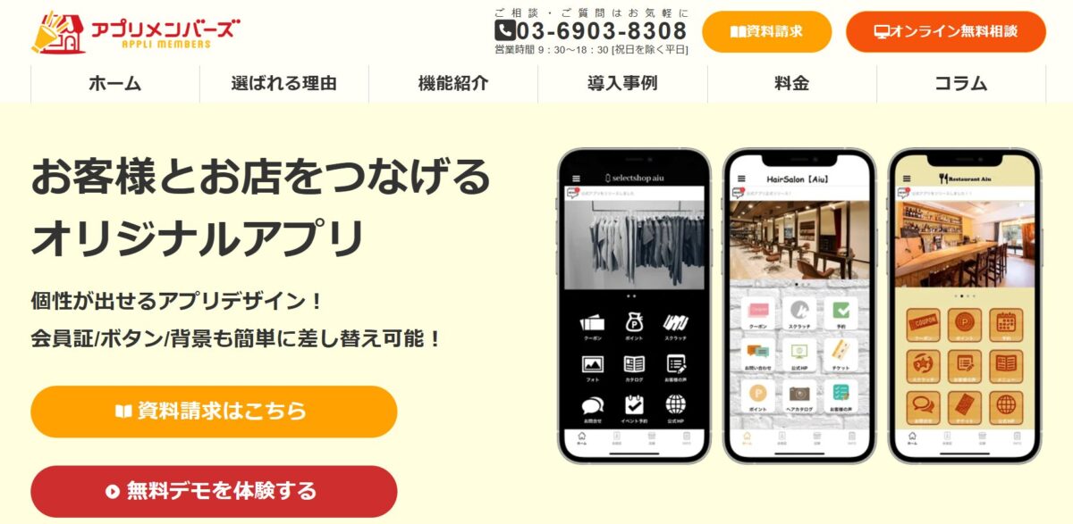 POSレジメーカーの株式会社ビジコムが運用するサービスで、アプリ開発~導入、月額利用費がすべて無料。店舗ページ作成やプッシュ通知、デジタル会員証発行などが可能です。